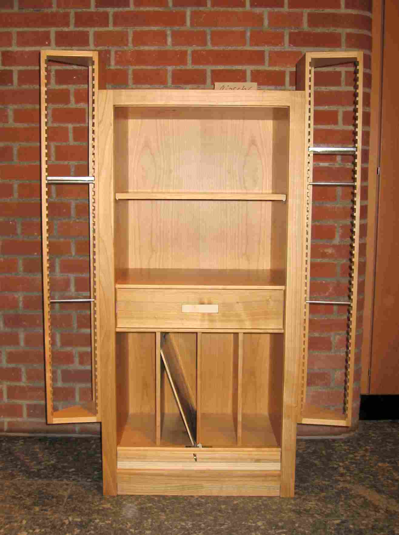 Joerg Nirschl Phonoturm in kirsche, rolladen ahorn,oberfläche dd-lack, korpus und cd-ohren gezinkt, böden gegratet, schubladen mit hölzerner vollauszug.